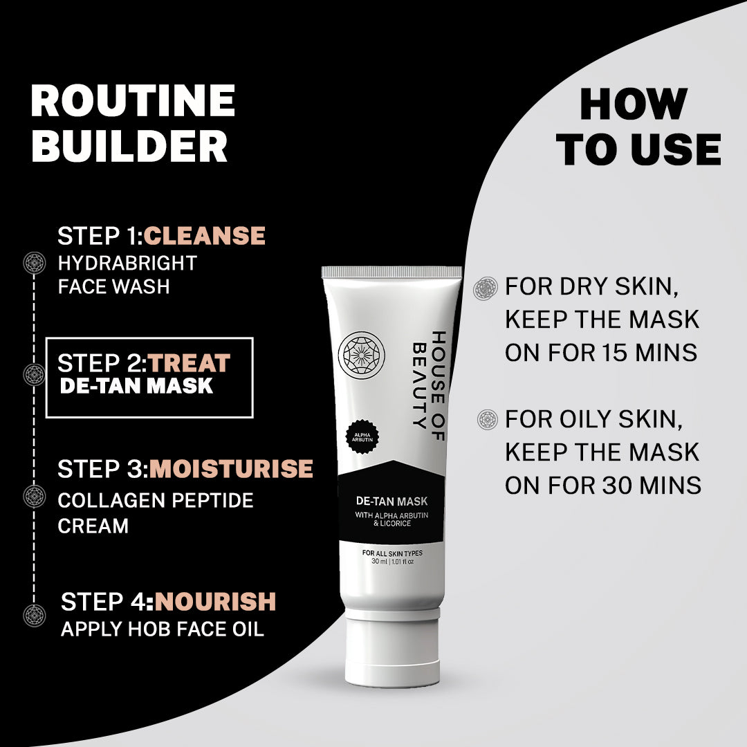 With excess sun exposure our skin starts to tan and form uneven dark patches. House of Beauty’s De-tan mask is perfect for your go-to at home Tan Removal routine. With the power ingredients - Fuller’s Earth, Kaolin Clay combined with Alpha Arbutin and Licorice Extract, it penetrates deep in your skin providing an even tone and hydration to your face. Thus, it is ideal in reducing any pigmentation or dark spots and improving the overall skin tone.