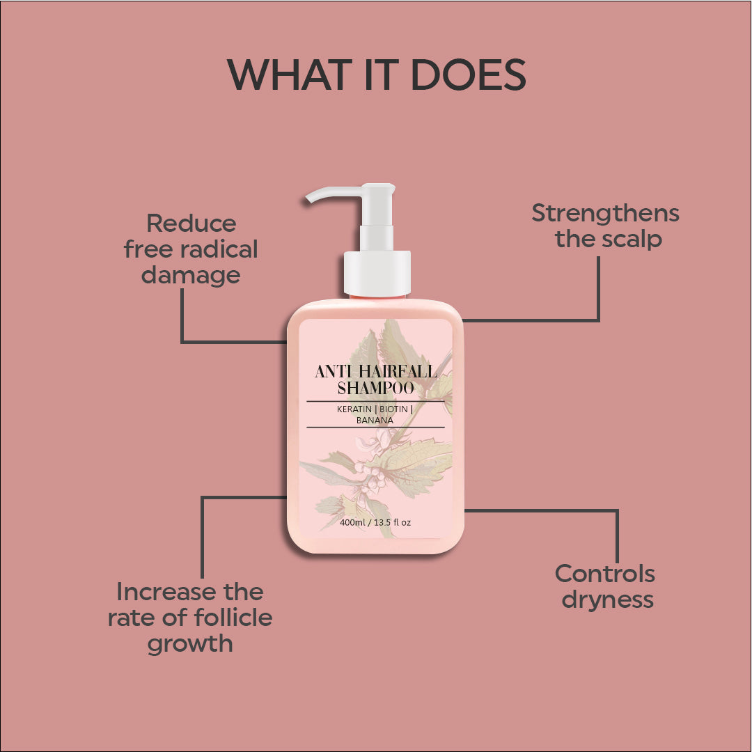 A perfect Combo of Anti Hairfall Shampoo & Conditioner, a must have for thicker tresses  House of Beauty’s Anti-Hairfall Shampoo contains superfoods like Keratin, Biotin, Banana and Bhringraj extracts, it strengthens the scalp while stimulating hair growth. Rich in antioxidants and with anti-inflammatory properties, it helps reduce free radical damage while preventing premature greying of hair. AnaGain, Biotin (Vitamin B-7) and Wheat Protein further nourish and increase the rate of follicle growth, resulting in hair regrowth while repairing damage to hair follicles.