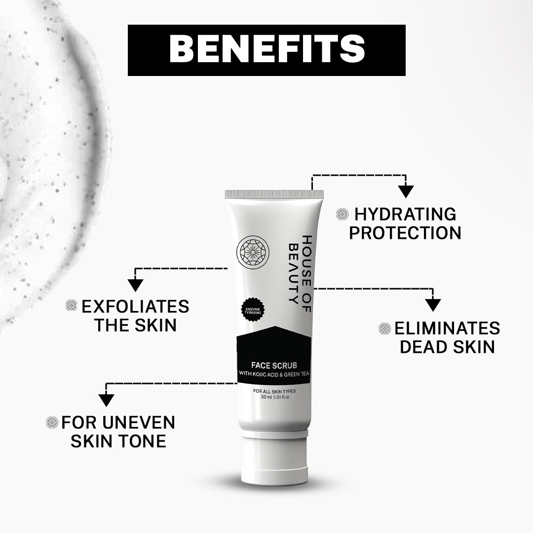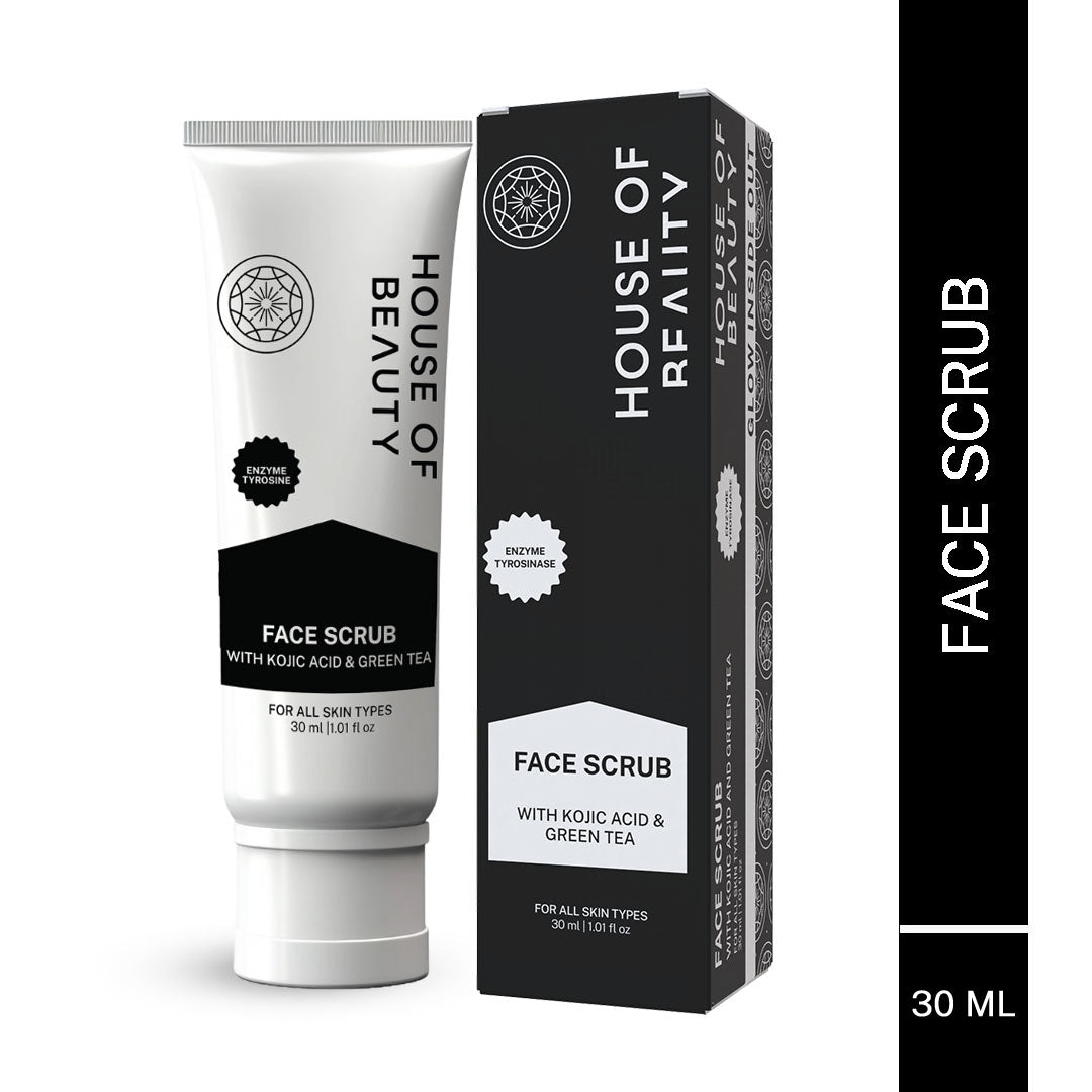 Constant skin exposure to pollution, sunlight, blue light from screens continue to deplete the overall quality of our skin. Skin needs exfoliation "Once a Week" House of Beauty’s Face Scrub comes with the strength of Shea Butter and Mango butter to leave your skin smooth, moisturized and further prevents inflammation. Kojic Acid with its amazing Anti-Ageing properties helps diminish the sun damage and dark spots on your face. Licorice Extract and Green Tea Extract further provide hydration and soothe and calms the skin.