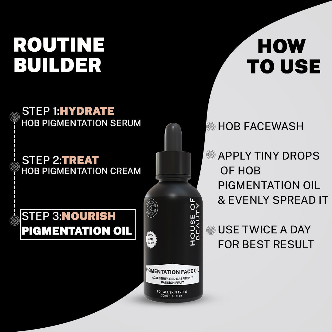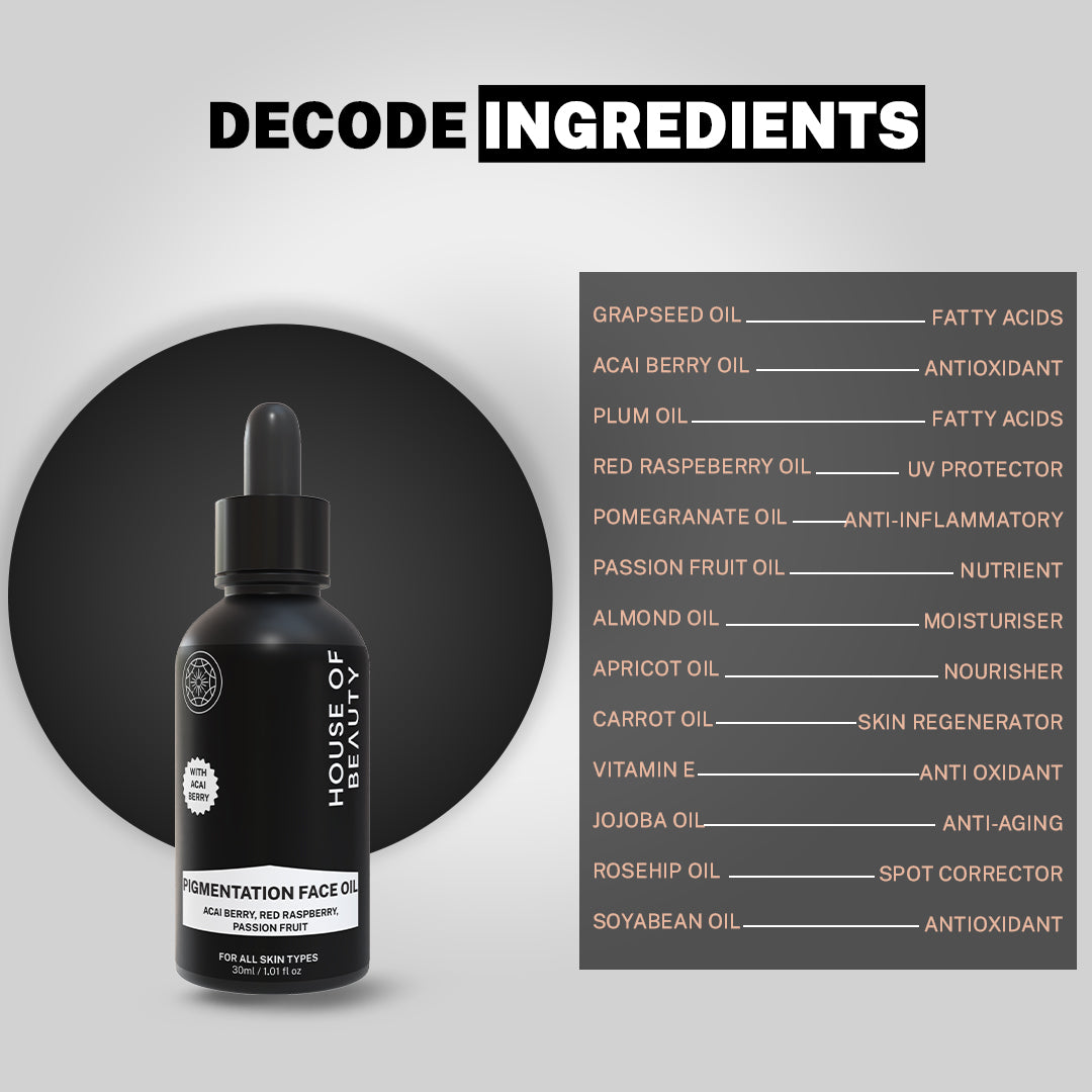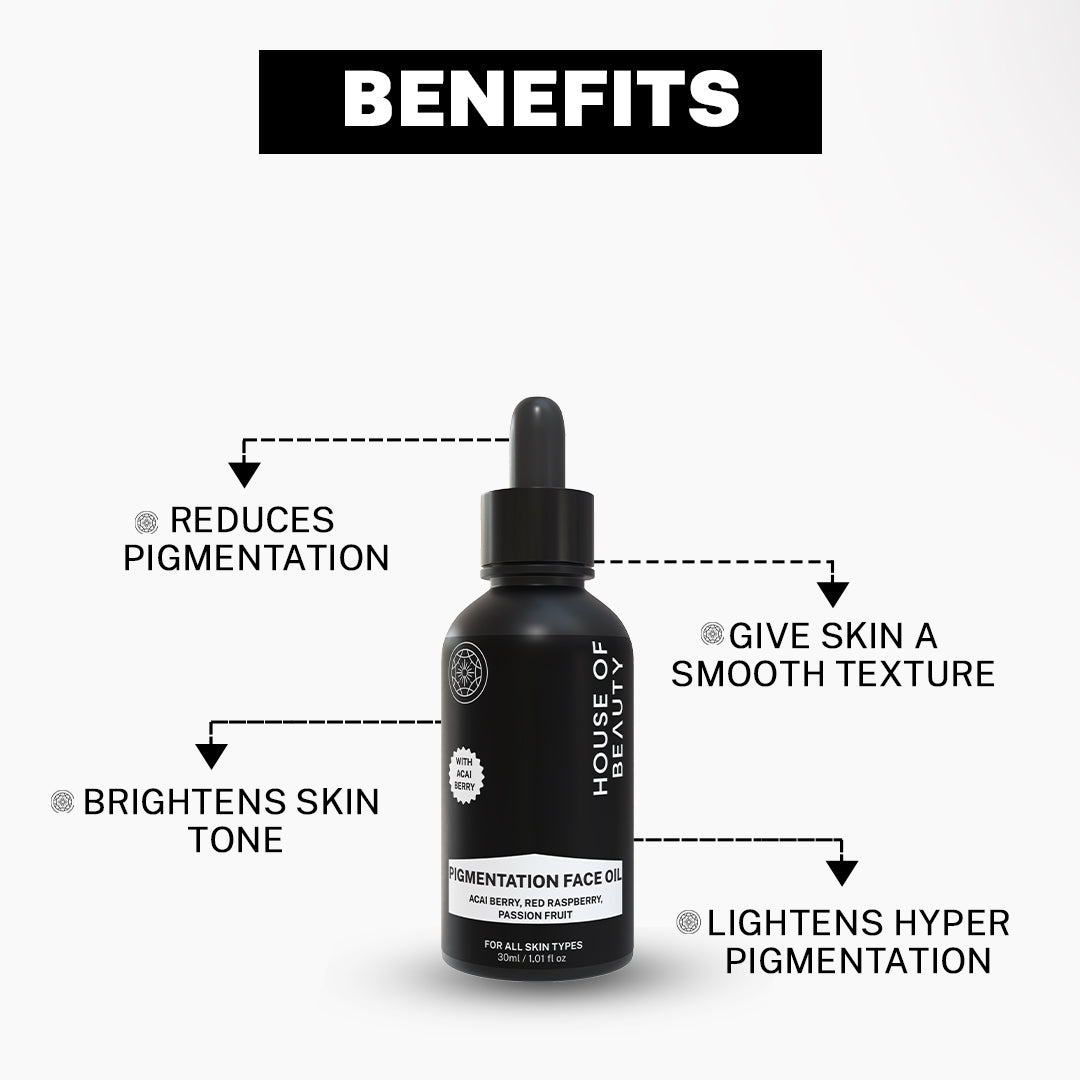 House of Beauty Pigmentation Oil is the perfect way to overcome your damaged & darkened skin and encourage the right amount of melanin production. The special blend of antioxidant fruits- including super food acai berry and natural nutrients to heal the troubled skin. This Oil works like a charm on all skin types and brings back the lost glow and lustre.