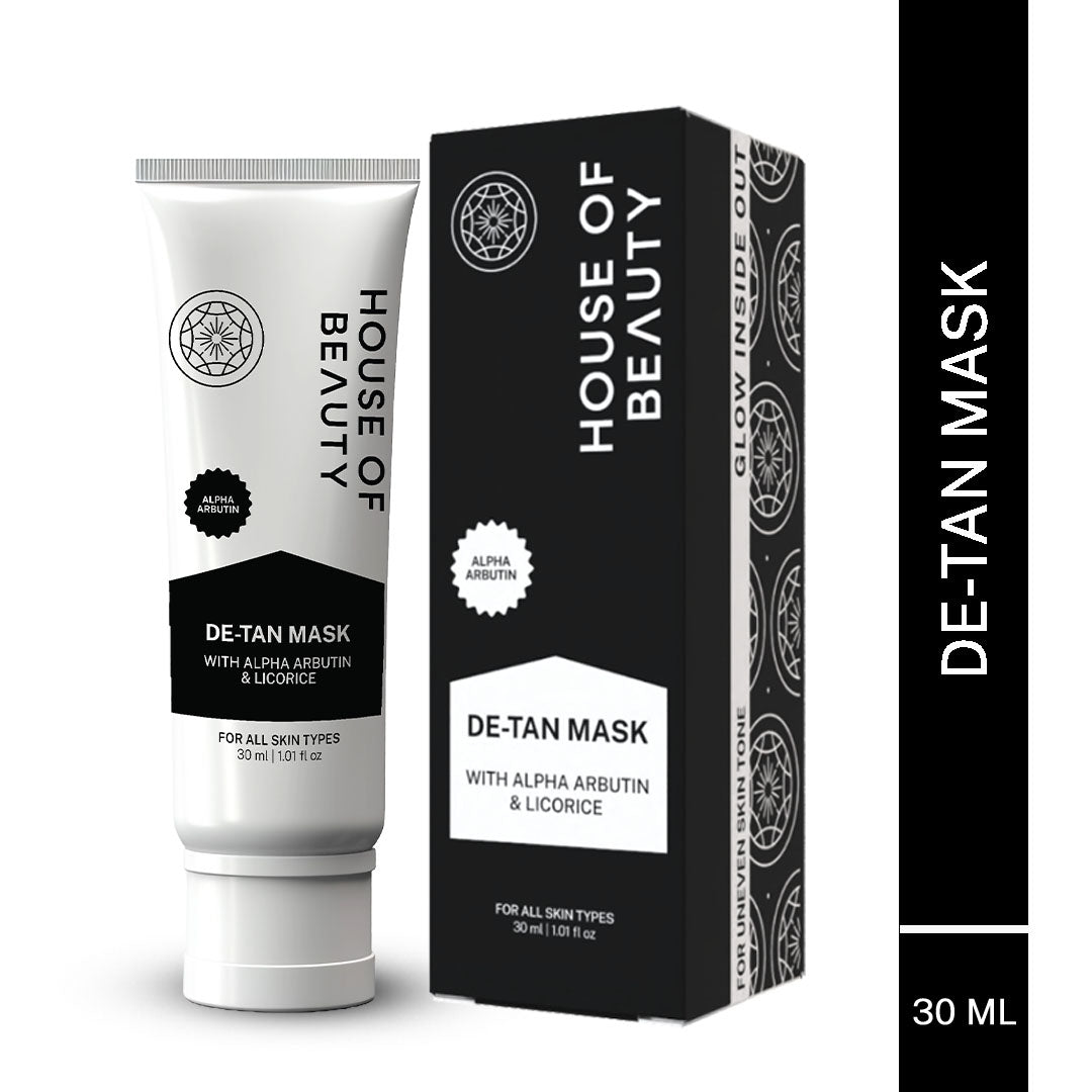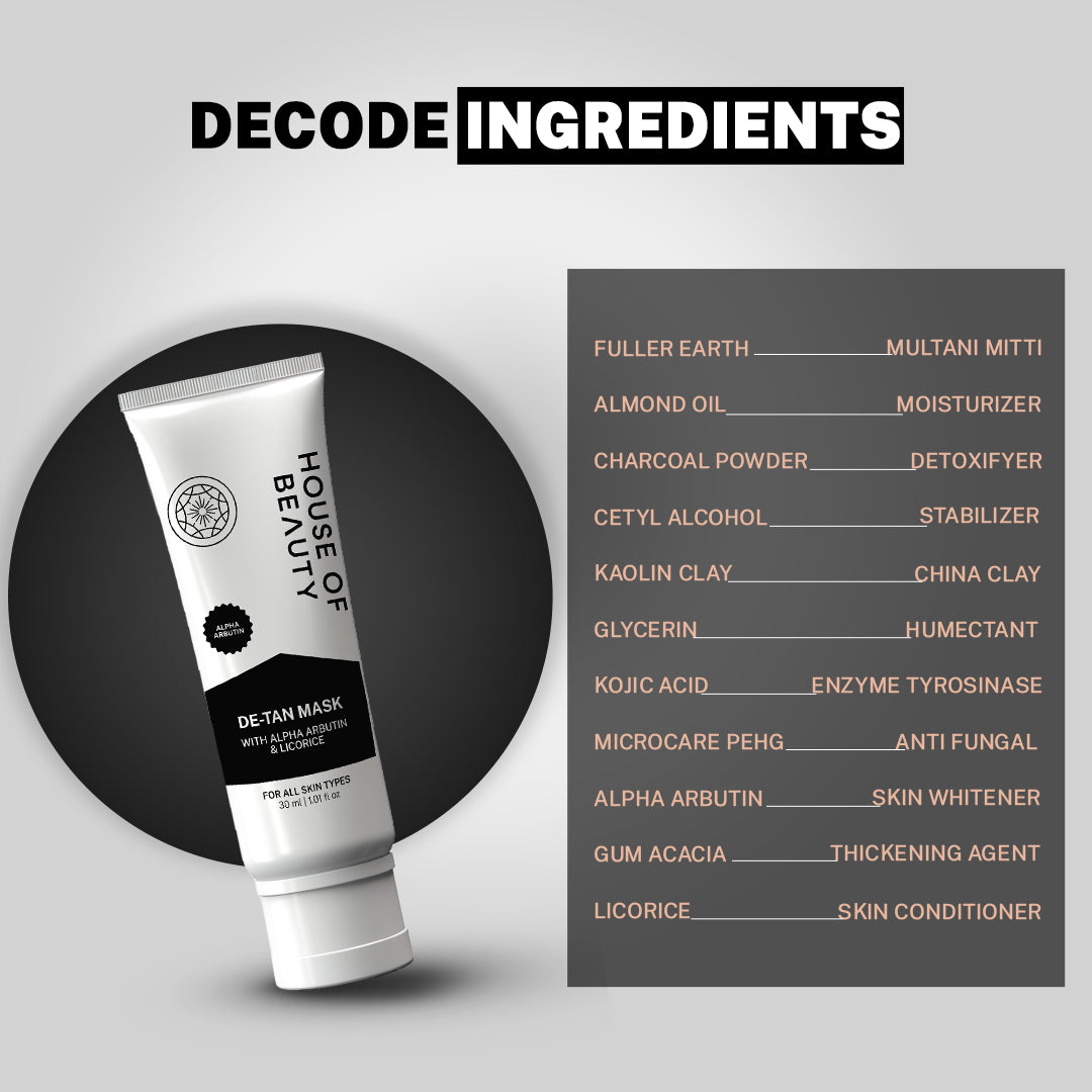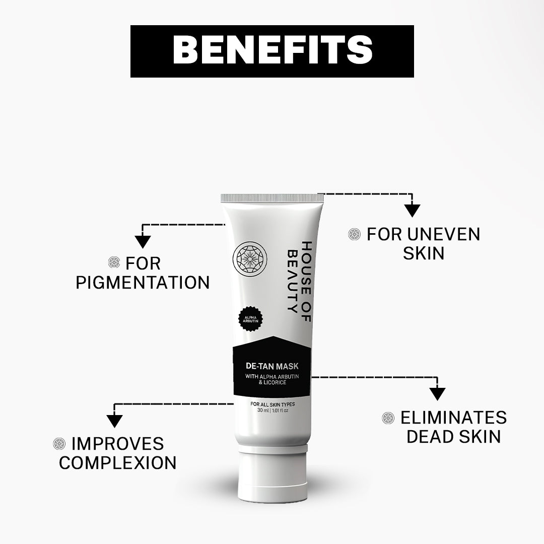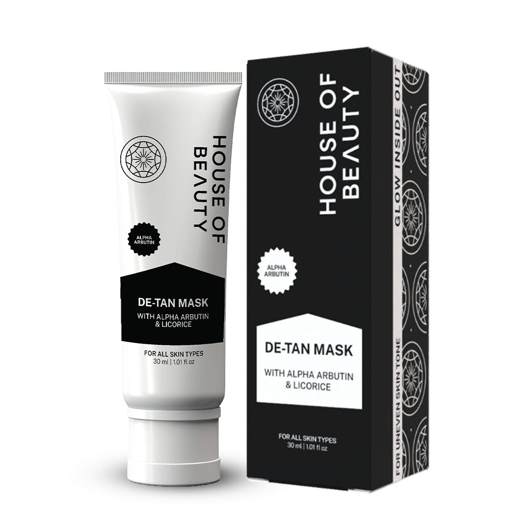 With excess sun exposure our skin starts to tan and form uneven dark patches. House of Beauty’s De-tan mask is perfect for your go-to at home Tan Removal routine. With the power ingredients - Fuller’s Earth, Kaolin Clay combined with Alpha Arbutin and Licorice Extract, it penetrates deep in your skin providing an even tone and hydration to your face. Thus, it is ideal in reducing any pigmentation or dark spots and improving the overall skin tone.