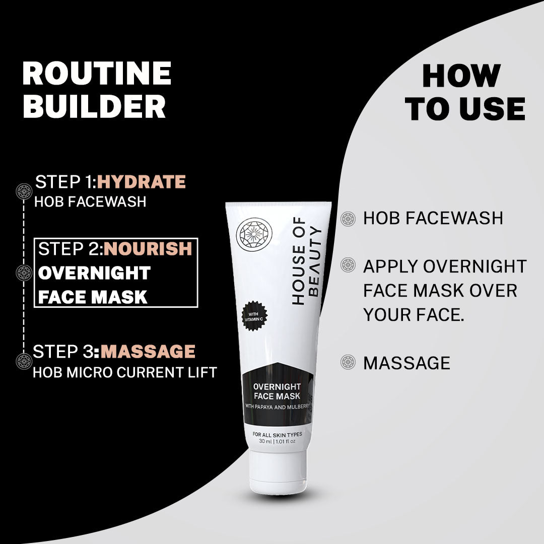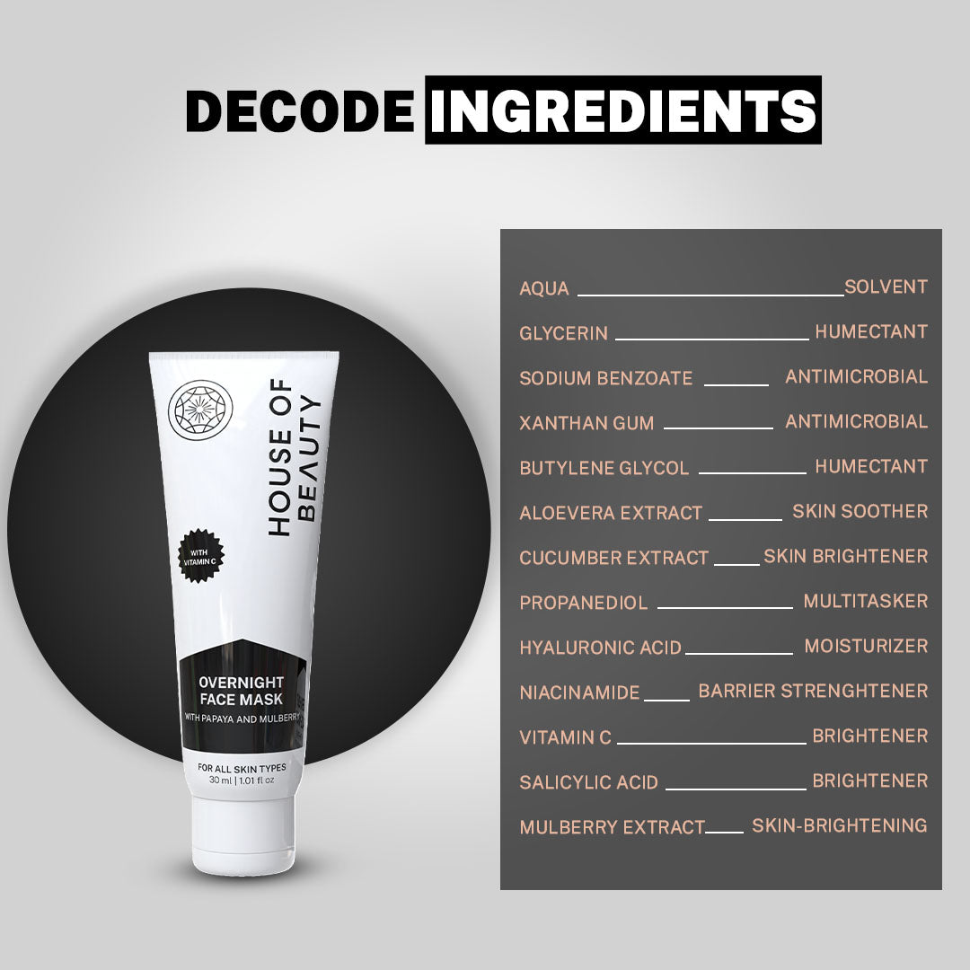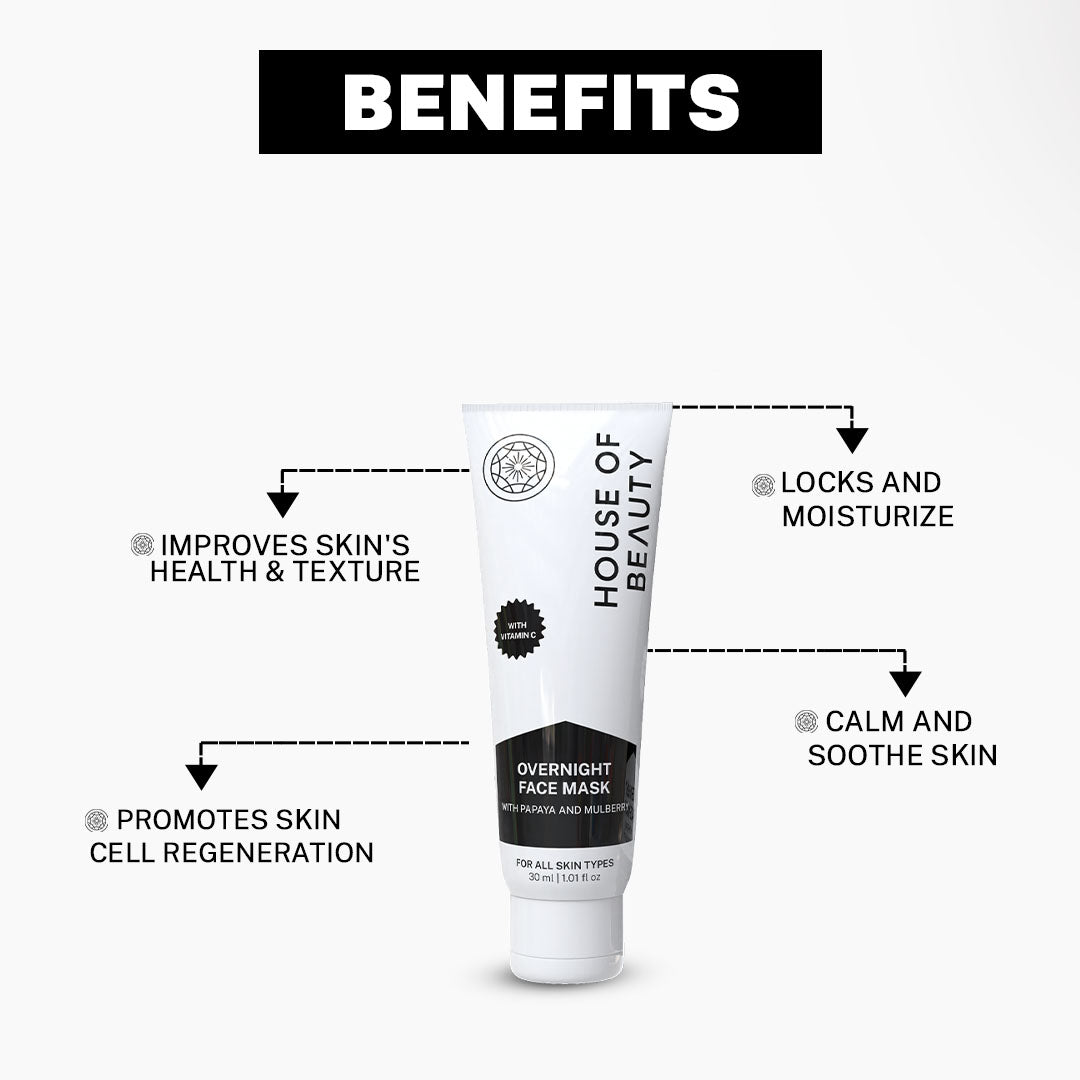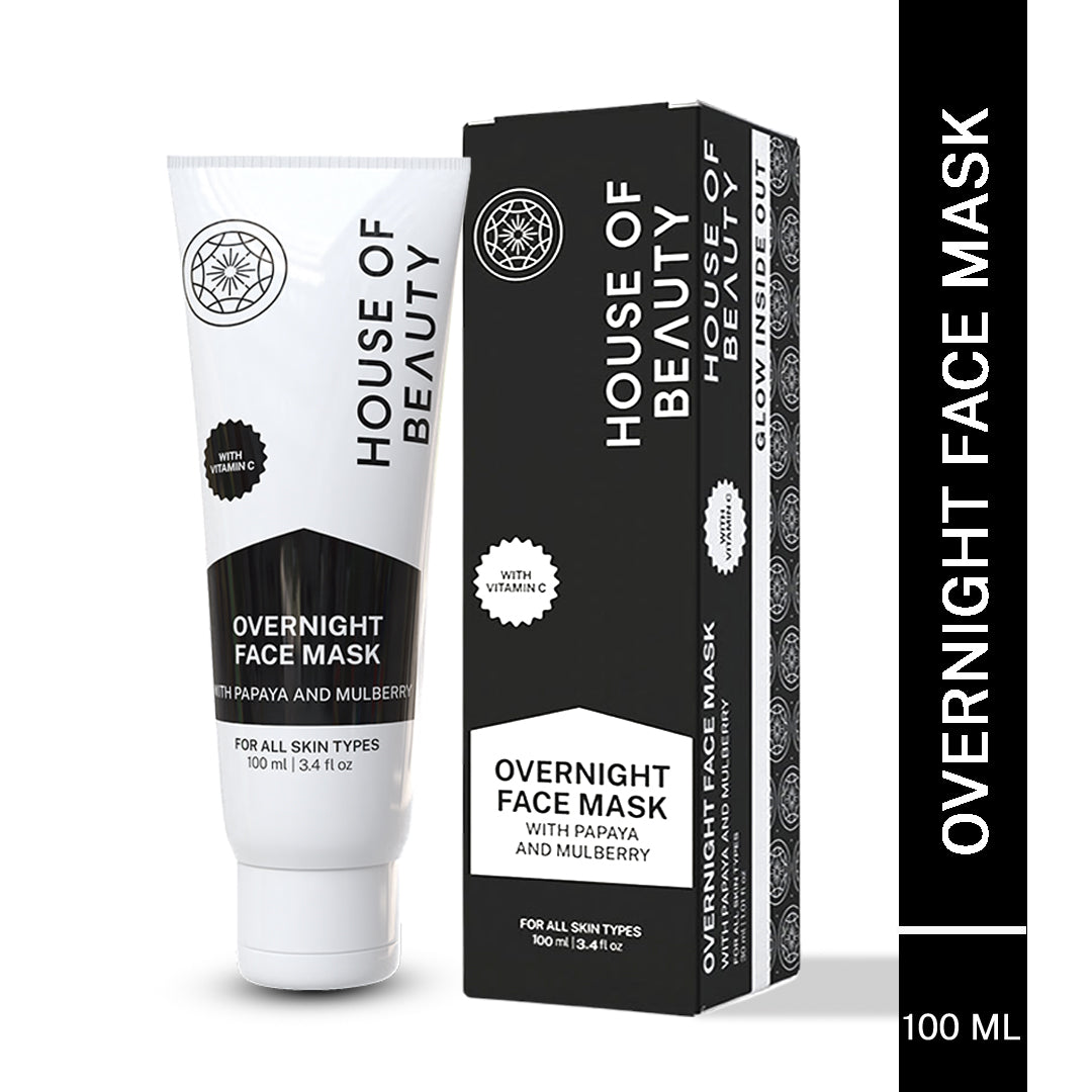 All the environmental factors aggravate the persisting skin conditions like acne, hyperpigmentation and signs of ageing. Need a mild skin detox treatment? Presenting House of Beauty’s Overnight Face Mask with super ingredients like Mulberry, Papaya Extract and Niacinamide which provides care to your face and rejuvenates your skin cells. It overcomes skin discoloration and hyperpigmentation and sloughs the dead skin cells off the face unveiling a healthy glowing skin. Enriched with Vitamin C, it helps diminish signs of ageing like fine lines & wrinkles along with protection from sun damage. The hydrators- Aloe Vera, Cucumber and Hyaluronic Acid further nourish the skin and help lock in the moisture.