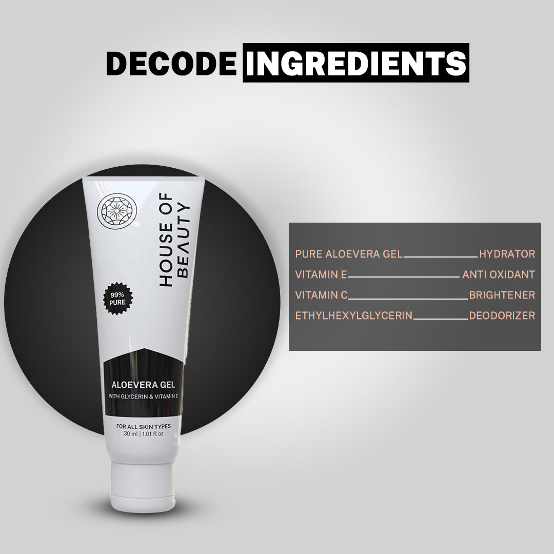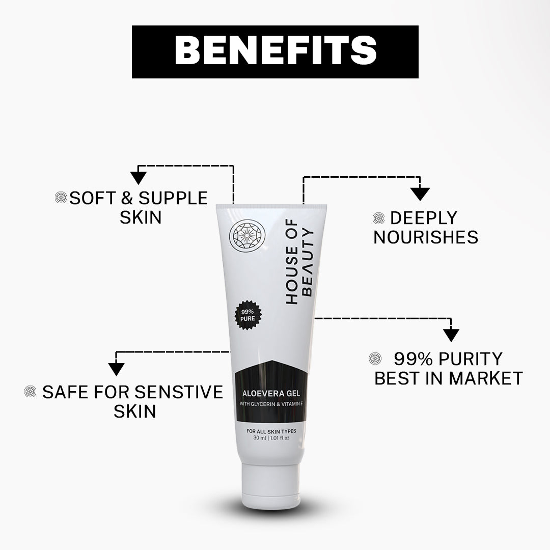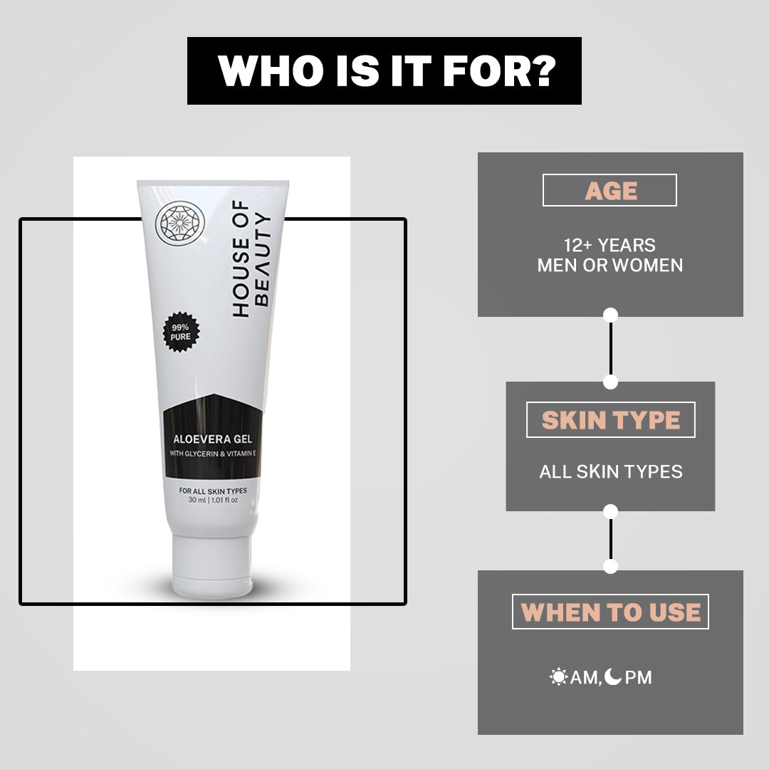 House of Beauty’s Aloe-Vera gel contains the super ingredient - Pure Aloe Vera which boosts collagen production in skin, tackles skin issues like skin irritation, acne, skin redness, insect bites, abrasions, skin ageing and is even beneficial in Eczema and Psoriasis. This gel with its antioxidant and antibacterial properties helps in skin inflammation and leaves it soft, hydrated and moisturised. Can be stored in the refrigerator for an extra cooling effect.